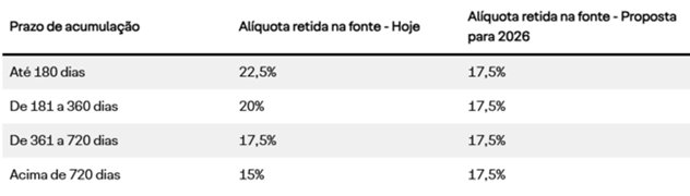 Já para os demais ativos de renda fixa, a proposta é fixar em 17,5% a alíquota de IR, independentemente do prazo da aplicação. Com isso, deixaria de valer a tabela regressiva como é hoje: